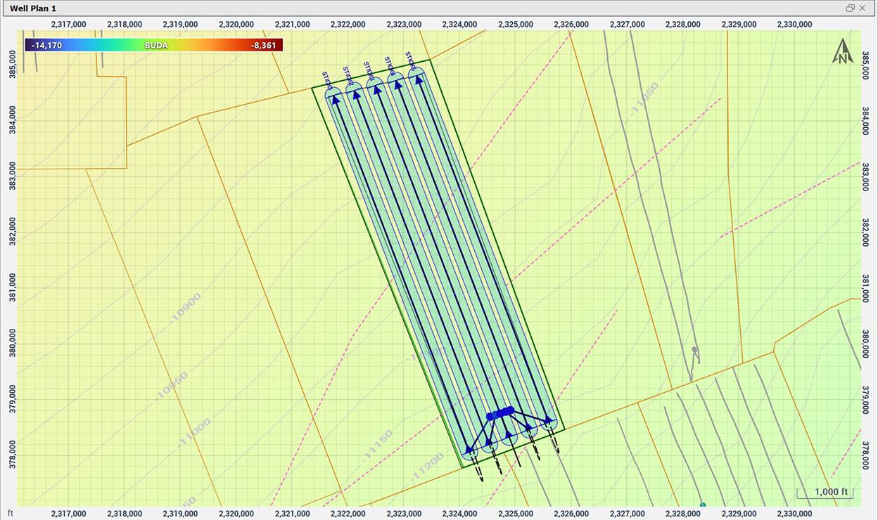 - From sticks to full well plans: Convert sticks into detailed well plans tied to structural grids. Target lines and waypoints refine landings and lateral paths.
