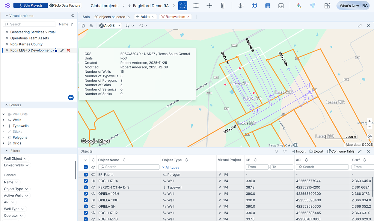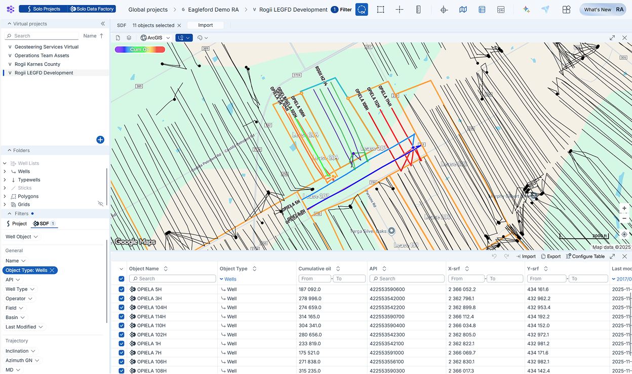 Knowing who’s around your next lease is important for extraction optimization. Activate the Solo Data Factory Layer to plot regulatory wells alongside your project data, then filter and import regulatory datasets.