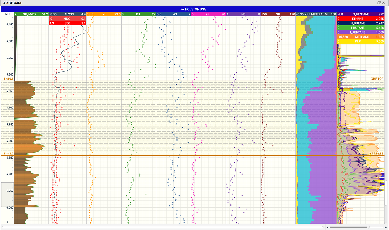 Knowing the composition of geologic basins is an important step to understanding production performance and drilling targets. Use the Correlation Panel to visualize mudlogging data such as gas, % lithology, and XRF/XRD values.