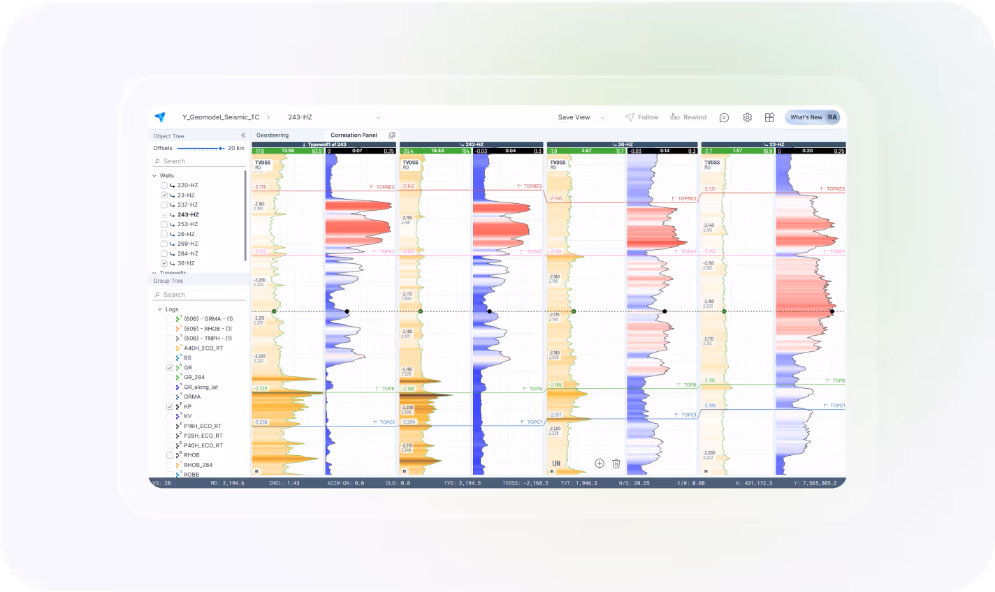 Easily view and compare key log curves and formation markers across offset wells to recognize geological patterns and better visualize your stratigraphy.